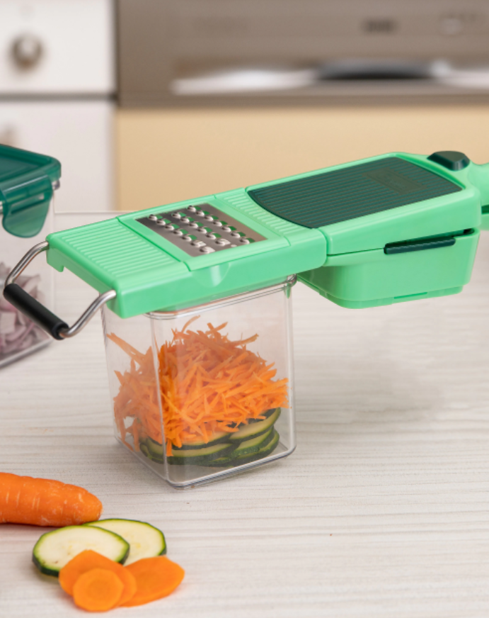 تجمع إدخالات التقطيع القابلة للدمج في قطاعة الخضار العديد من أشكال التقطيع: شرائح ، مكعبات ، أعواد ، سداسية ، جوليان ، مبشورة ، مقطعة إلى شرائح وأكثر من ذلك بكثير في جهاز واحد فقط. اكتشف قطاعة المطبخ بطريقة جديدة. فهو يجمع بين تقطيع البصل ، قطاعة الخيار ، مبشرة البطاطس وأكثر من ذلك بكثير. قطع الفواكه والخضروات الطرية أو الصلبة مثل الكوسة والزنجبيل والطماطم والبصل والفطر والليمون والمزيد!